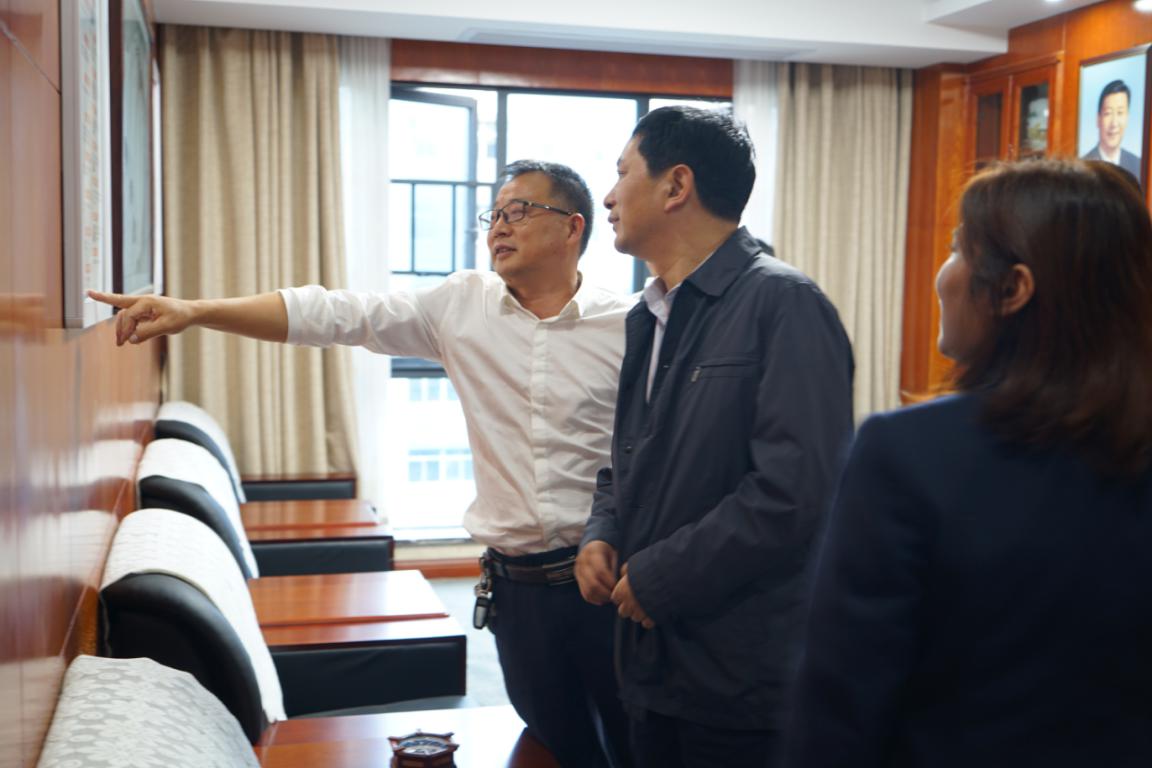 (刘中杰向陈晓林介绍律所发展) 参观考察完后,调研组一行在宇能律师事务所会议室进行了座谈,戴华彪主持。调研组一行认真听取了参会人员对法学会工作的建议,参会人员希望法学会能下设专业研究会,搭建平台,促进娄底法学界包括理论和实务界的沟通交流,建立法律共同体;带领法学会会员参与立法调研,参与社会治理,监督行政执法,参与司法改革;加强法学会自身建设,开设微信公众号、建立微信群、出版刊物、开展论文评选等;扩大法学会工作的影响,多搞些活动,请进来,走出去,多出成果、出大成果等。