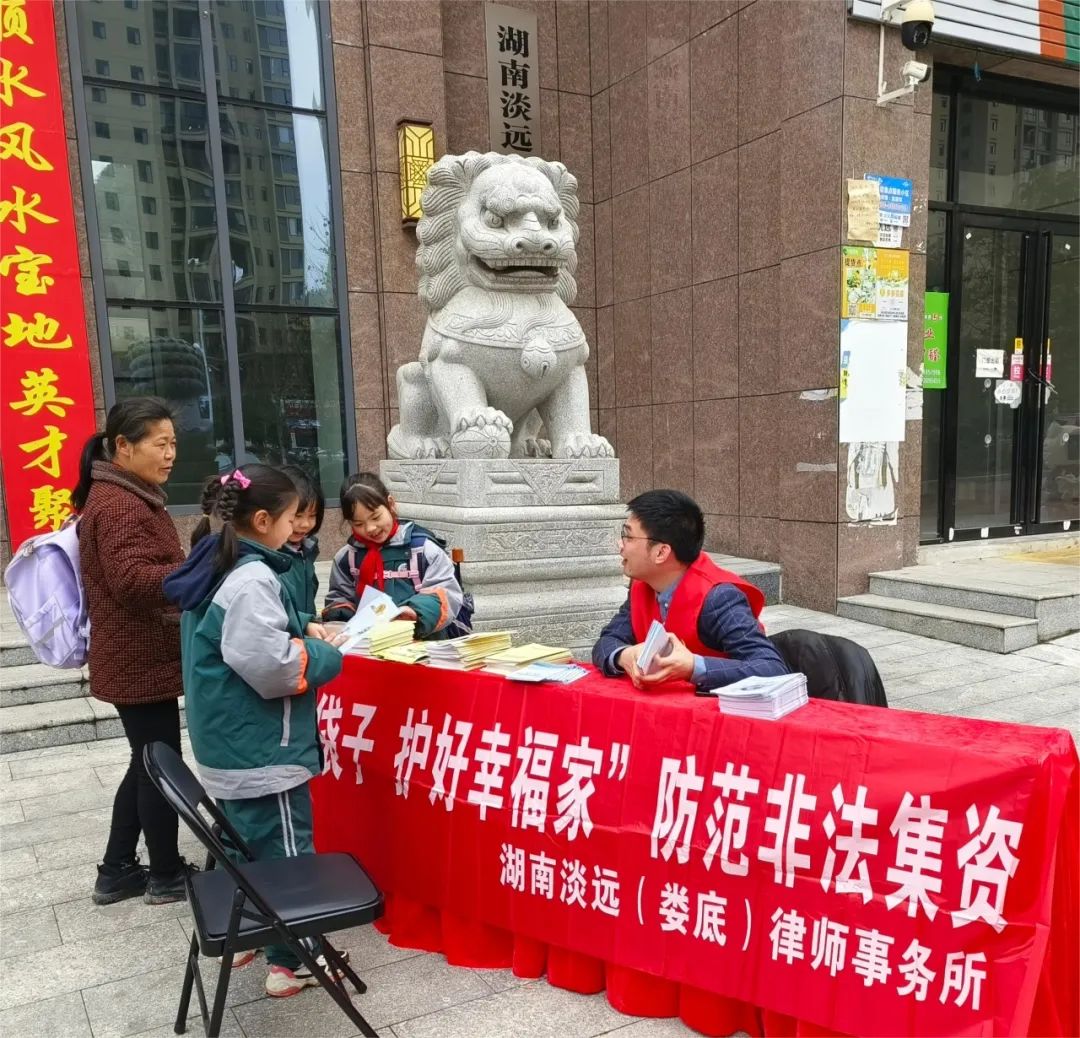 【新征程·新作为·新形象】“守住钱袋子,护好幸福家”防范非法集资普法宣传活动2024年3月5日是全国第61个“学雷锋纪念日”和第25个青年志愿者服务日,为纪念雷锋同志,弘扬雷锋精神和志愿服务精神,湖南淡远(娄底)律师事务所在乐坪大道石化大院社区开展“守住钱袋子,护好幸福家”防范非法集资普法宣传活动。 活动当日,律所主任带领全所律师“送法进社区”,通过面对面的宣讲和发放防范非法集资宣传手册、《防范和处置非法集资条例》辅导问答等宣传资料,让附近社区居民耳闻目染,入脑入心,将防范非法集资意识烙于心中。